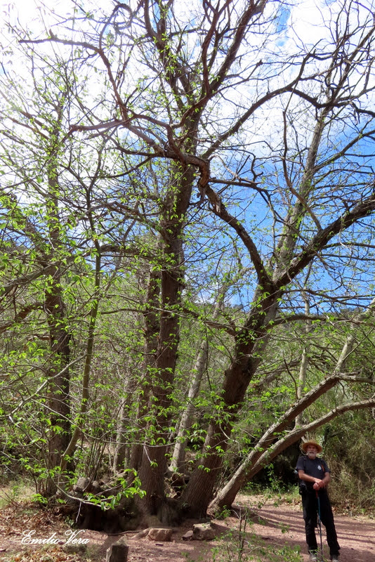 A partir de aquí, además de las trincheras y restos de la guerra, empezamos a disfrutar con la presencia de monumentales ejemplares de alcornoques. Mirad éste, por ejemplo. Detrás el majestuoso alcornoque. Posando delante, otro alcornoque, pero ése, nada majestuoso.
